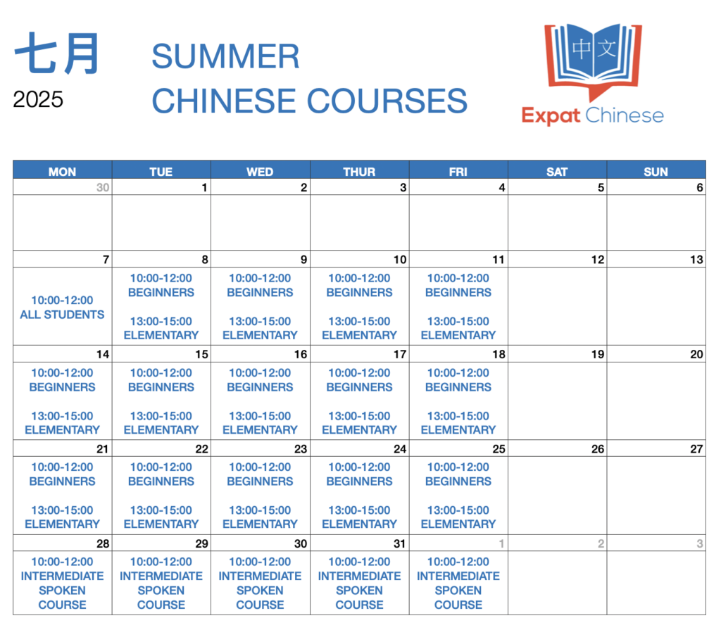 Expat Chinese organizes three intensive Chinese courses in July 2025 in Guangzhou. 30 hours Beginners, 30 hours Elementary and 10 hours Intermediate Spoken Course.